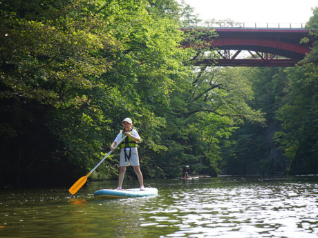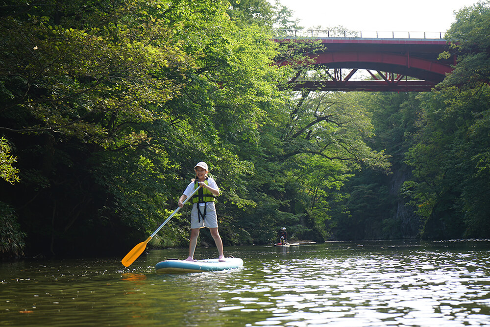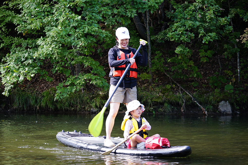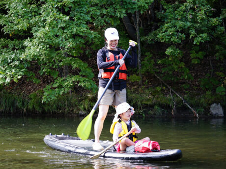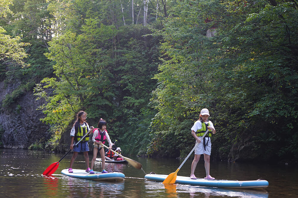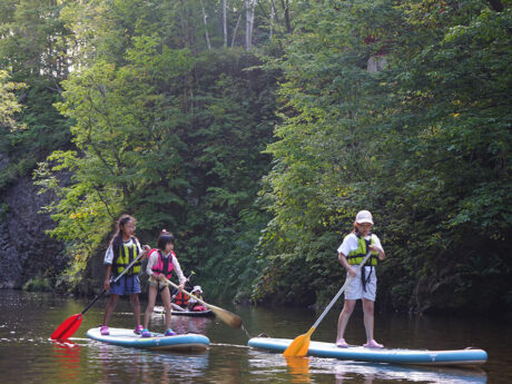 札幌市内を流れる豊平川で、人気のSUP体験を! 定山渓温泉横の渓谷をフィールドに、ボードに立ったり座ったりしながら景色を満喫。川の水深は平均1メートルほどで流れも緩やかなので、万が一、水の中に落ちても心配無用です。慣れてきた頃には、自らダイブする人も。浅いのでお子様の参加も可能です。